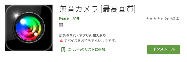 アプリで、”無音カメラ”と検索すると、多くのアプリが存在します。
